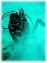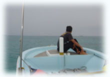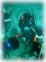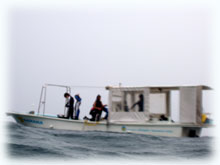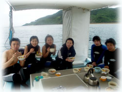 今日のお天気はあいにく・・・曇っている・・・。が、今日のゲストさん達はラッキーでした。今日は去年11月お越し頂いたウエノさんが、またまたいらしてくれました。ウエノさん、朝一出航にて初体験の海底温泉でウチノヒトとマンツーマン入浴(海底=19mなので、勿論ウエットと器材装着デス・・)してきました。