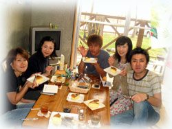 温泉から帰ってきてから、他のゲストサンと合流。ウエノお二人に、昨日に引き続きのユキエさん、そして、サトシさんとタカコさんです。今朝、このお二人をお迎えに行った時の会話。