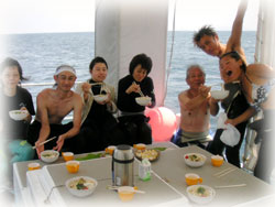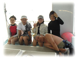 今日は、きのうに引きつづきのゲストサンばかりです。64歳ダイバー(4歳ともいう・・・)ミツヒロさん、カズコさんご夫妻。そしてカトウさん、ミヨシさん、オカモトさんです。昨夜み〜んな花火を見ていたそうです。今日はまったり2ダイブ〜。