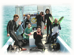サンゴと地形を堪能して、2本目をエキジットです。ホントに今日はいいお天気〜・・。カズコさん200本記念ダイブオメデトウゴザイマシタ。ぶかぶかの寒寒ウエットはオンナの人には堪えるはず・・。この機会にぜひ新しいのを新調してもらって下さ〜い・・・。そしてコレカラも年の差20歳っ!のミツヒロさんと仲良くダイビング続けて下さいねー。。