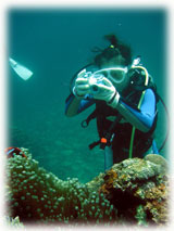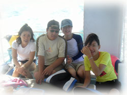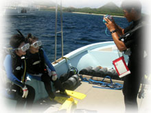 今日のゲストサンは・・・・・まずはとうとう石垣島プチ移住も終わりに近づき、ラストダイブのカナさん。最初は体験ダイバーさんと一緒に潜ったことを思えば、ずいぶん上手になりました。今日は初デジカメに挑戦です。そして、去年の7月にお越し頂いたカワグチユウコさんが、今回はダンナ様のヨシヒロさんを連れてご登場。ダンナ様は、体験ダイブに挑戦です。奥さんの方が緊張しているのはナゼ??