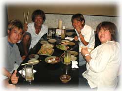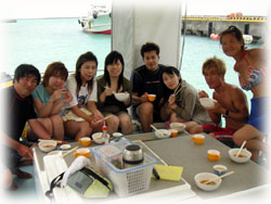 わいわいと、 バースデーダイブを含めた2本を無事終えて、波が高くなる前に港へ帰港・・。台風準備で、船が次々陸揚げされ人が行き来している港でランチです。。