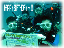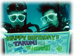 ・・・ナノニ、コンナ時に一人石垣島に到着してしまった人約一名・・・・・・・・・・・・。ワタシタチスタッフは・・・「まぢ??」と冷や汗たらり・・・・。。今ついたばかりの人に、明日の朝便で帰ることを強く勧めているのはとても辛い・・・。今回バースデーダイブの予定を見事に裏切られたそのゲストさんと、今晩今から、せめてもの宴会をしてきます・・・・。
