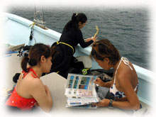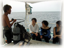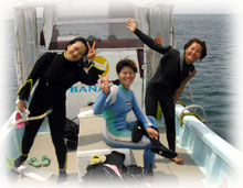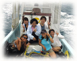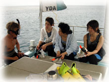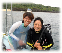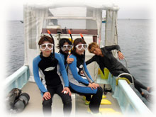 いつも登場してくれるサトコちゃん、 そしてチカコさんはホヤホヤダイバーです。レアな方です・・・( 沖縄の人のダイバーさんは珍しいのだ) 体験チームは・・ユウコさんは2度目の体験ダイブに挑戦。ユウカさん、イシミネさんは、初めてのダイビングに挑戦ですっっ。
