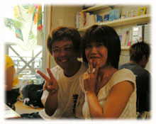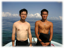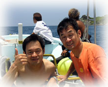 | 今日もいいお天気です。今朝は、まず3本希望の方のみ朝一ダイブ。マッシーとウチノヒトとて出港・・竹富の南です。。 ワタシとトモは、その間、空港お迎え・・・。 今日の朝一からご参加のゲストさんは・・・去年の九月にいらして下さったヤマオカマナブさんが、またまた登場してくれました。しかも・・・今回は双子のお兄さんタケシさんと一緒〜・・。コレガ又うり二つ・・・って双子だから当然なんだけど・・・。そして、保母さんのアユミさんも3ダイブです。。
