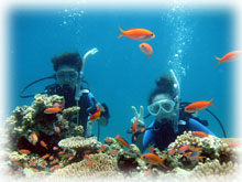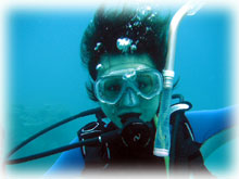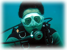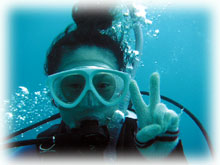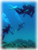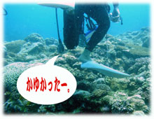 先日のマンタ乱舞はなんだったのか・・と思うほど、 今日は静かなマンタスクランブル。 マンタを見たことがないカイさんに見せたい・・ と必死に目をこらすけれど、なかなか見あたらず。 しかし、みんなでカクレクマノミを見ていたとき、突然マンタ登場っ 真横を通過してくれました。 小ぶりのマンタは、そのままメインの根に向かい行ってしまいました・・。 。 でも、初マンタです。その後もガンバッテ探しましたが、逢えませんでした。 またぜひ、今度は大きなマンタをリベンジで。