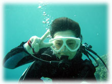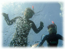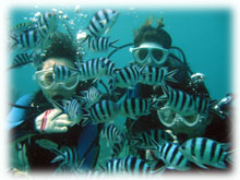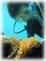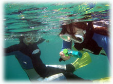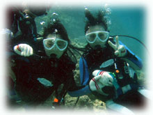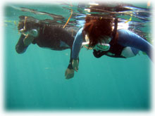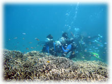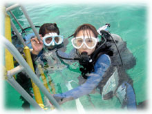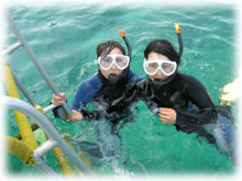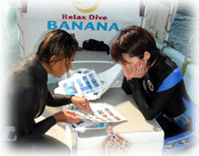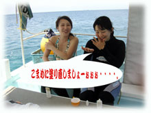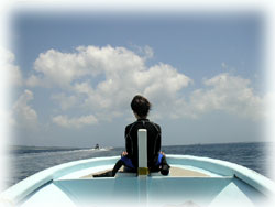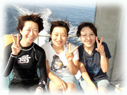 そんな今日のゲストさん・・昨日は残念ながら体調が優れずダイビングはお休みだったリツコさんが復活っっ。。・・で登場です。リツコさんは、ちょうど去年と同じ8月2日にいらして下さいました〜。。あれから一年かぁ・・・・一年降りのうれしい再会です。ハードなオシゴトの休息を、去年とは少し長くこの島にて過ごしておられます。。そして台風前の危機一髪ゲスト・・・チエさんとアキヨさんっっ。ニコニコ体験ダイブに挑戦でぇっす。今日はキレイドコロ3名のゲストさんたちとワタシタチ=5人でマッタリ出港です。