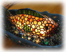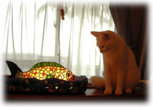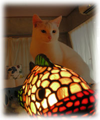 午前中、島の友人・牧ちゃんにステンドグラスのランプを発注しに、暴風雨が吹き荒れる中、お家にお邪魔しにいってきました。。「今ならまだ行けるっ」とでたものの、結構な強風・・・。 様々な形のすてきなステンドグラスのランプを見せてもらって、あれも欲しいこれも欲しい・・こんなんも欲しい・・・・・。でも、私のはさておき、プレゼントの品をまず作ってもらいます。