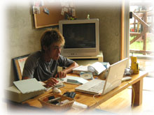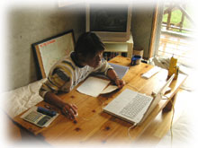 ・・・・久しぶりのゆっくりとした夜です。 夜、台風 の目に入ったようで、激しかった暴風雨がぴたりとやみました。 気持ち悪いほど、無風で、ゴーゴーいってた風の音はやみ、 カエルなんかが平和にゲコゲコ鳴いてます・・・。 ・・・ほんと静かで不気味なほど。 でも、確実に今、台風9号は島の上にいてるのです・・・・。 この台風の目を抜けると風向きが反転し、 今までのよりも激しい暴風が吹き荒れるのです。 まさに嵐の前の・・・・。 風が反転して南よりになると・・・ ベランダ側からは風圧でひずんだサッシから、雨水が吹き出すのです・・・。 夜中は眠れそうにありません・・・・。 。