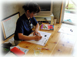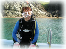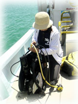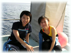 さてさて、そんな今日のゲストサンは、昨日に引き続きファンダイブ2日目のケイコさん。そしてマイデジカメでデビューのトシコさん。そして実は実は・・トシコサンのお母さんのヒロミさんは、今回ダイバーになるべく張り切っておられる講習生としてご参加なのです。。ダイバーサンお二人は、朝少し早めに出港。そして講習の方は午前中イッパイは、学科をひととおりクリアして頂こうとワタシとお店へ・・この日のために、予習をガンバッテ頂きました。いいお天気で海も静かになり始めました。台風が去ってホッ・・・ですねー。。