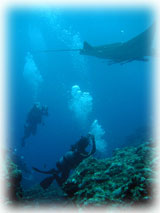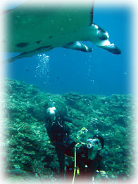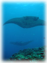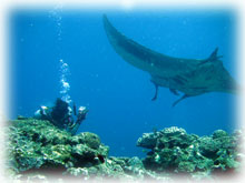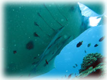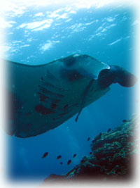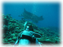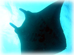 そして、午後から・・・いよいよマンタへ・・っっ。ウエムラさんは、去年の6月にマンタに逢って以来、石垣に来られるたびに、台風などでマンタに会えず・・。今回こそは・・っ、気合いが入ります。ポイントについたらスゴイ船の数。ワタシがアンカーをウチに入ったら、BANANA号の真下にマンタがホバリングしてるっっ〜。