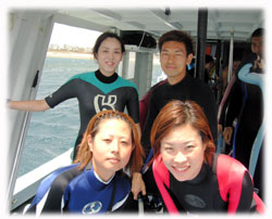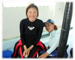 今日もお天気はいいのですが、まだまだ強い風が吹いてます。朝起きたら、海の状況をチェック・・。今日も乗合での出港デス。今日お世話になるのは、シーフレンズさんの船です。 本日、到着のゲストサンが2名様(←と言っても条件付きフライトらしく、つくかどうかビミョウ・・・とのこと・・)プラスすでに来られている4名様。本日ご到着のゲストサンには事前に話をし、ダイビングは明日からにして頂きました。そして残り4名様は、ダイビングです。 まずは、長ーい滞在、とびとびのダイビングの生活でしたが、台風で1日つぶれて今日が最終日・・・のアキコさん、ナオコさんのお二人。。〆ダイブが時化になってしまいました。そして、今日からご参加のイシダスグルさん・トモコさんご夫妻。美男美女のご夫妻です(ダンナさまは・・なんとなく仲村トオルチック)。