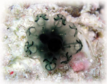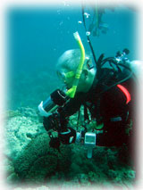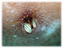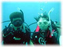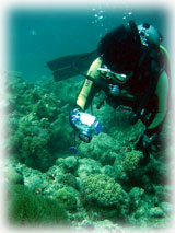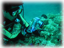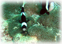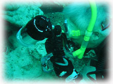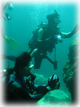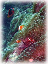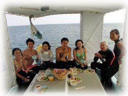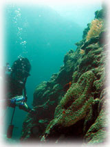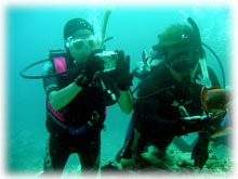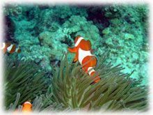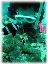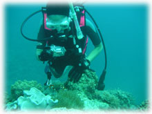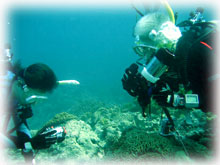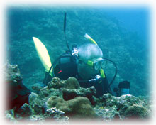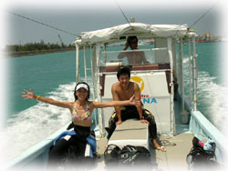 今日は昨日よりずいぶん波が落ちていました。透明度が悪い・・というより台風の影響での白濁りがあり水は余り良くはなかったけど、それぞれのペースで撮影して頂けました。ココではワタシのチームは、大きなホワイトチップシャークを見ることができました。みんなが近づいたら、悠々と泳ぎ去っていきました・・・。おとなしいサメだけど、やっぱり動くと恐い・・。透明度はやはり濁り気味だったけど、コースを一通り廻ってみて、このポイントのサンゴも去年に比べて格段に死んでいることに、今日気づいた・・・。ここは、枝サンゴもテーブルサンゴの類も、本当に素晴らしかった・・そのイメージでいたから、風景が変わっていて本当にショックが大きい・・・。立て続けにきた台風の影響かなぁ・・・。。。