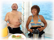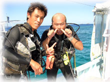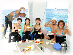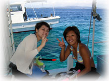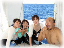 今日も夏夏夏〜ないいお天気ピーカンです。しかも、透明度がいいっ。海があおーい・・・。 そんな今日のゲストサンは、ついこの間の12日にバースデーダイブで潜りに来て頂いたアムさんがまたまた登場〜。一旦帰って、またまた来られましたっっー。 そして、色の白い3人組は、ファンダイブのユカさん、マユミさん、そして体験ダイブのヒロカさーん。和気藹々と出港で〜すっっ。 。