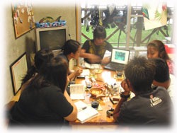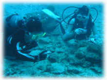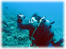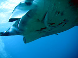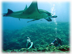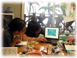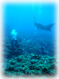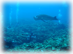 マンタスクランブルで撮った写真の端っちょ小さく写っているブダイの種類まで熱く語る・・の巻。その横で、「これって食べれますか〜」