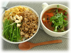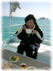 2本潜られてから、 ポカポカランチタイムです。 昨日の話で、カズエさんはタイ料理大好き というコトが分かり・・・・・ 今日のランチは 香菜たっぷりっ 野菜タップリのトムヤムスープ♪ そして、3色ソボロ丼です。 完食ありがとうございま〜す。