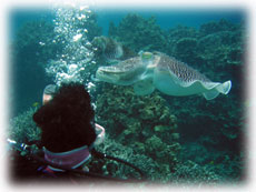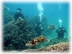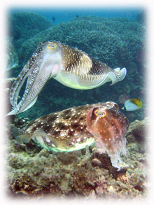 それぞれが自分のスタイルで潜りました。初ファンダイブのユタカさん、そしてアキラサンは今日は少し浅めで潜りました。ヨシコさんはカメラで激写、マユコさんは海の中でバースデーです。クロサワさんは・・・今朝の飛行機の中から海の中までオシッコを我慢してきたそうです・・・・。。今日のコブシメは、オスの争いが凄かった・・。海の中でも恋愛は熾烈な戦いなのだ・・・。