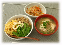 今日はソボロ丼とゆし豆腐汁と切り干し大根。