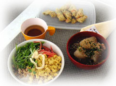今日は4色ソボロ丼とふろふきあんかけ大根。