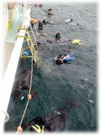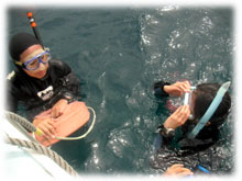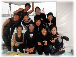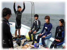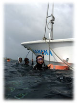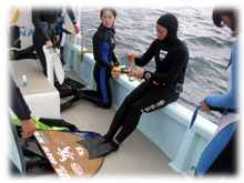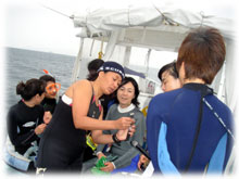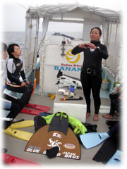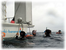 船の上で、もう一度ブリーフイング後、まずはメグミさんのモノフィンによるデモンストレーションです。61mの記録を持つメグさんの、しなやかなドルフィンキックに一同うっとり・・・ 。
