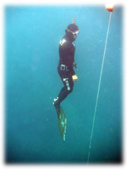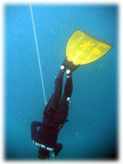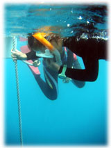 その後、2チームに分かれてノーマルなフルフットフィンでそれぞれバディー毎に潜水を始めます。まずはロープを頼ってまっすぐ下りていく姿勢を身につける・・・。ワタシもシゴト上素潜りは毎日だけど、ロープのところでまっすぐ入る機会もないし、姿勢とか頭で考えたことなかったので新鮮でした。
