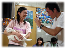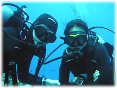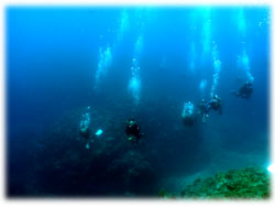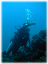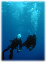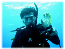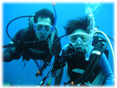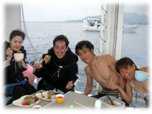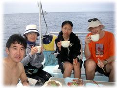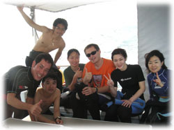 今日のゲストさんは・・・きのうに引き続きのタテノさん。そして、鯛焼きを差し入れして下さったコモリさん。そしてそして・・トシミツさんとカスミさんの仲良しカップル。カスミさんは、サイパンでダイバーになられて日本初ダイブだとか・・。そして、なんと身長190センチ(!)のトーマスさんとヨウコさんご夫妻。お二人は、以前アメリカのフロリダでダイビングインストラクターをされていた大ベテランさんです。賑やかからに出港っ。今日はマンタリクエスト。でもその前にまずは名蔵へ・・。