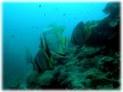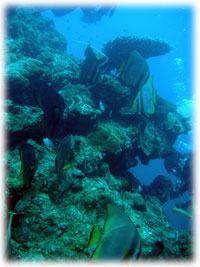 マンタは、最初の一枚の後は・・・・見られず・・。ハナゴイの群、パンダダルマハゼ、イソギンチャクエビ、イソギンチャクモエビ、ハマクマノミ幼魚、クロユリハゼのコロニー、グルクン山ほどなどを見つつ・・・・。静かなポイントに移動して、遅いランチタイムです。