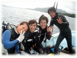 今日も賑やか〜〜。きのうに引き続きのカナさん、ノリコさん。そしてチカちゃんが加わりカシマシ3人組揃いました。。チカちゃんは、去年10月以来のお越しでーすそして、地元のリュータローさん。極寒の1月以来です。珍しく風邪気味だそう・・・潜れるのか〜?? そして、お会いするのは2月の大阪ばなな会以来、潜られるのは、去年の9月以来のヤマオカガクさん。実は先月、双子のお兄さんのツヨシさんが来て下さったばかり・・。同じ顔に同じ声・・。でも、お久しぶりなのは、不思議〜な感覚デス。潜りたくてワクワクのガクさん。楽しんで欲しいです。台風の影響で、うねりが心配ですが、以前からずっとずっとリクエストされている御神崎へ向かってみました〜。