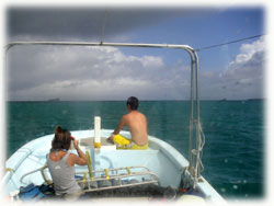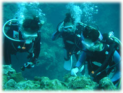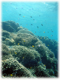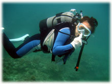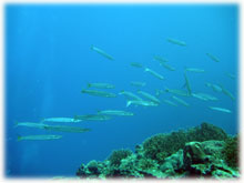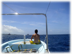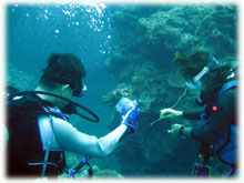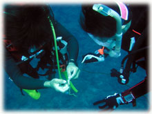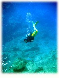 カメラなしチームは、本当に水中をめいっぱい楽しんでる感じデシタ。最近は、デジカメブームでカメラを持っている人が多くなってきてますが、カメラを持たなくても、色んな生き物をみんなで観察して関心したり、自分の好きな生物に逢えてニコニコ眺めたり、水中の浮遊感や海中から見上げる太陽をじっくり味わったり、時にはスレートを使ってサカナのお絵かき大会がみんなで始まって爆笑したり・・。謙虚なダイビングの原点の様な気がシマス。ニンゲンが海に呼吸しながら潜れるだけでスゴイ。そんな水中を丸ごと楽しむ・・・。海で出逢う生物の珍しいモノ「だけ」に価値を持つ風潮が巷にあったりますが、貴重な出逢いも一つの感動や楽しみの中の1つとしてとらえ、「それだけ」に価値や楽しみを限ることなく、すべての五感を使って丸ごと楽しめる人というのは、ホントに心から海が大好きなんだなーと改めて感じました。