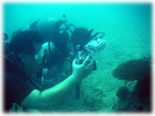 撮影チーム、ベテランのぜんさんのストロボは、前回破損・・3度目の正直で無事光ってくれました。。そしてガクさん。ガクさん曰く、「なかなか上手く撮れなーぃ・・」と言うことですが、ダイビングでの水中撮影は、水と言うフィルターを挟んでいるし被写体が動きまくるので陸の様に簡単にはいきません。納得のいく撮影を楽しむには、ダイビングのスキルはモチロンのコト、まずは自分の使用カメラを使いこなすこと(それぞれの光や色などのクセやタイミングがあるので慣れること)そして魚などの被写体の生態や行動を知ることが早道な気がします。そしてタクサン撮ること。デジカメのタイムラグを克服するには、タクサン撮っていいショットの確率を上げることも一つの手です。が・・・やはり一番は、楽しむこと。気持ナシでタダ撮るだけでは技術が上手くても、所詮 記録写真でしかアリマセン。魚を覚えるにはいいけれど、被写体をかわいい、美しい、素晴らしい・・と思う気持が納得のいく写真につながるのだとワタシは思います。