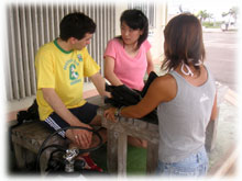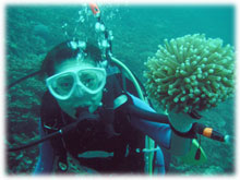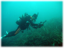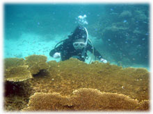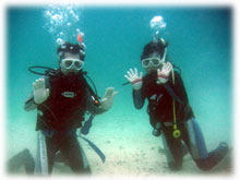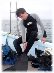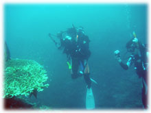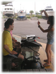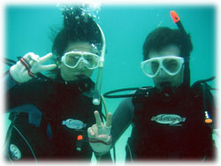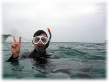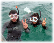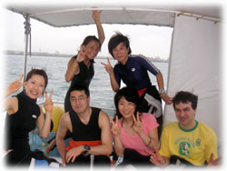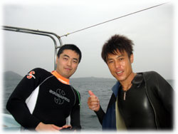 さて、その間のワタシタチは、港でブリーフィング。ローマンさんは、海に潜るのは勿論のこと、入るのもほぼ初めてなくらいお初です。ココで大きな問題がっ。「ワタシはドイツ語が話せません・・」。シナノさん曰く、「英語も大丈夫ですから〜」・・・・・ワタシが英語が大丈夫ではアリマセン(;-_-;) ・・・。 ・・・と言うことで、ワタシの説明を一つ一つシナノさんに通訳をお願いして、じっくり説明をしていきました。。 ダイブマスター候補生のミワさんが 細々なことをアシストしてくれます。