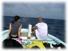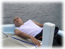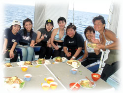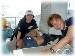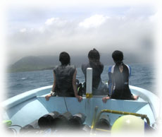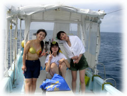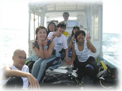 今日は、昨日のメンバーのミラクルmaruoさん、エミさん、アイダさんの3名さまと、東京ばなな会ではお会いしているモノの、ばななダイブは去年7月以来のケンジさん、そして今年の3月に来られて約4ヶ月ブリのよーこちゃん(←ひとり合宿でおなじみっ)の5名の予定でした。しかしながら、昨日のサトミちゃん&ミホさんが台風乗合いの為ばなな号に乗れなかったのは残念・・・と言うことで、今日ばなな号リベンジをしたい・・という希望。。今日のメンバーさん達はみなさんばなな会での顔見知りの方々ばかりだったので、サトミちゃん達のお友達で石垣島に移住してしまったアユミちゃんを加え8名貸し切りに・・・・・と言う話を今日のメンバーの方々に頂き、急遽ひとりヘルプガイドきよちんをお願いして、スタッフ3名、ゲスト8名貸し切りで出港になりました。。今は地元アユミちゃんもBANANAのゲストさん。去年の6月以来のご参加でーす。