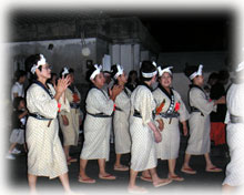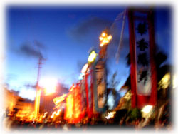 お店に帰ってから、ダイブマスター講習の課題評価。台風前の急遽決まった講習の1日でしたが、今日でかなりの課題をミワさんクリアすることができました。コレカラもまだまだガンバッテ下さいね。港でウチノヒトとゆかちゃんは台風対策。またまたばなな号をぐるぐる巻きに縛ってきました。。 そして、 シゴトが終わって今日は豊年祭。五穀豊穣のお祭りの季節です。日没頃からウチノヒトとテクテク歩いて出かけてきました。今年は台風接近の為、もともと明日開催予定を1日前倒しをして開催されたのでした〜。汗のにおいと銅鑼の音。さーさーさーさー・・という掛け声・・・。あぁお祭りの季節だっ・・。。。