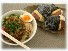 今日のランチは・・ 肉みそゴマそうめんと ポーク卵おにぎりです。
