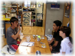 きのうのうちに船は陸揚げして台風に備えてます。そして、今日はビーチでも行きたいっっっ・・と言うことでお越し下さったシバノマサノリさん・エリさんご夫妻がきてくださいました。エリさんは、ダイバーさん。そしてマサノリさんは体験ダイビングなのですが・・・ダイバー顔負けの上手さでした。石垣島は遠浅で結構ハードですがいいですか〜・・・という話を了承して頂き、まずはお店でブリーフィングから。いきなり朝からドシャブリに見舞われ・・・うむむ・・・。でもま、まずはポイントまで行ってみましょうっっと言うことで、大崎に向けて出発です。