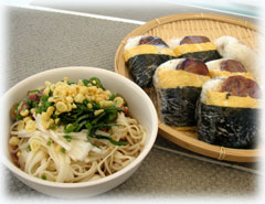 冷たーい冷やしうどんと、ポークタマゴおにぎり。