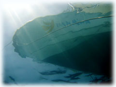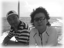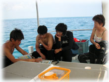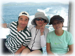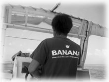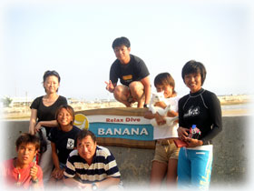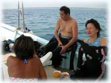 風がないせいで・・・ベタナギ鏡です。今日は昨日に引き続きのサトシさんとリョウコさん。島在住の整体師(←2回戦で登板した當山くんを施術したこともあるそうです)タナカのお母さんが6月以来の参加です。そして朝、那覇から到着されたのは、ムラカワカツノリさん・ナオコさんご夫妻です。今日は竹富島に向かいました。2チームに分かれてもぐります。