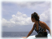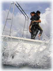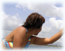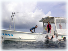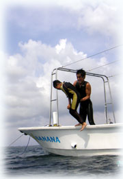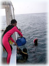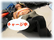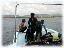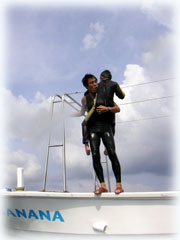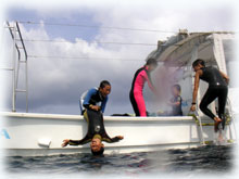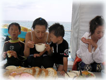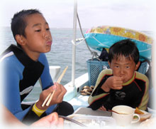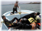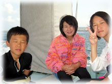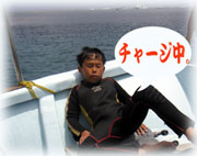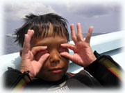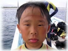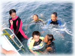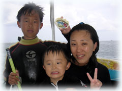 おとといのメンバーの、マユミさん・ショウリくん親子/ヒカルさん・ノゾミちゅん親子/マリコさん、ユウタくん親子に加え、今日はユウタの弟シュンスケくんが登場です。おとといまでは、託児所でいい子にしてましたが、今日は晴れて参加っっ!イッチョマエにウエットスーツが似合ってます。結局北風ばかりの3日間。今日も北風・・・・。船上に残る子もいるので、穏やかな海を優先して今日も東海岸です。でも・・・・だんだん水がきれいになり、午後からはスコーンと抜けて気持ちのいい海の中でした〜。
