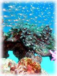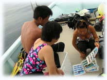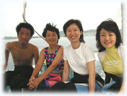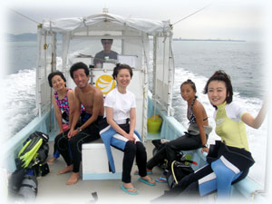 今日のゲストさんは、きのうに引き続きヤマグチユタカさん・アキラさん親子。そして、ダイビングは2年ブランクで緊張バリバリのクミさんとアサミさん。「大丈夫ですよーおお・・」となだめつつ(笑)竹富の南へ向かいました。。