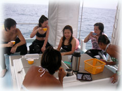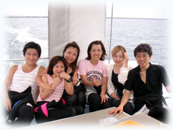 うーん・・夏はドコ言ったのか、曇り空の毎日が続きます。。。。 今日は、到着のゲストさんを待ってからの出港です。。去年6月に来て下さったキタガワさん&エノモトさんがご到着。そして、5月以来のイズミちゃんとサイちゃんが来てくれました。7月には台風で来れなかったので、リベンジ。昨日は西表でカヌーを漕いで筋肉痛らしい・・。そして、一昨年の6月以来久しぶりにいらしてくださったのは、晴れオトコのヨシさんっ。今日も晴れパワーくださーいっ。そして昨日に引き続き今日は一人でご参加のヒロコさんです。今日は竹富南へ・・・。。