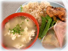 遅いランチタイムです。 今日は、しょうがゴハンとタンドリーチキンプレート。 熱いゆし豆腐汁と一緒にどうぞ〜。。