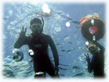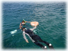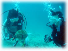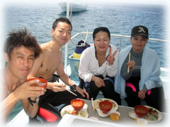 ・・・体験ダイブ、なんと1時間も潜ってました。最初スレートに「海の中はいかがですか・・」と書いて聞いてみれば・・しばらく考えた後・・「?」ハテナを一つ書かれました・・・。ハテナ・・・・?? 船にあがった後、「アレはどういう意味でしたか・・」と聞くと、「上がりたいくらいイッパイイッパイだったけど、だからといって上げられても困るから・・・・」状態だったとか。頭はハテナだった様ですが、でも後半かなり上手に泳いでおられました。