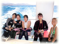 そんなラッキーゲストさんは、きのうに引き続きのメンバー。ヨーコさん、ケンジさん、クミちゃん、サトウケンジさん。昨夜は焼き肉やまもとへ行かれました。そして、今年の3月以来のご来島、ユミコさんがお越し下さいました〜。マンタ熱烈希望でしたが・・・残念ですがこの風じゃぁ無理ですねぇぇ・・・。そして9月に島に引っ越されてきたオサナイさん。離島ダイブはお初だそうですっ