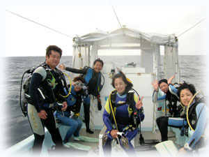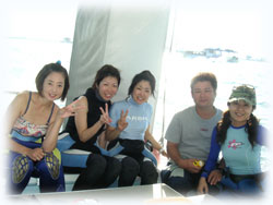 そのお方は・・・マユミさんっ!!←2年連続、真夏でもまさかの北風で時化てしまい行けるポイントが限られるという前歴を持つ筋金入り時化組さんっ。ハンパじゃございません。前回は、今年8月に悪ガキ・・ぃぇ・・息子さんのショウリくんをはじめ数家族合同ファミリーダイビングツアーで時化の中、ばなな号は遊園地と化す勢いの大騒ぎ・・。今回はマユミさんおひとりです。(ショウリくーん、良い子でお留守番してるぅ〜??)お仕事で那覇出張のついで??で石垣まで足を伸ばして下さいました〜(←明日は那覇でお仕事だそう)。。そして、昨日に引き続きの同僚ダイバーのトモコさん&ハルコさん。そして出張ではないけど出張ってことになってるご夫婦ダイバー・コウジさん、そしてマユコさんご夫妻です。。