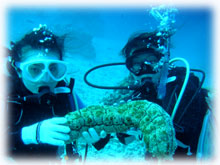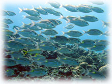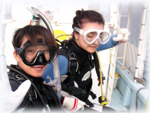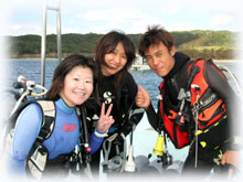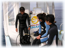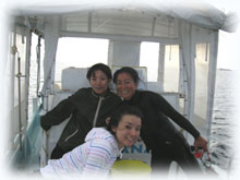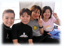 今日は、海が少し穏やかになりました。 今日は昨日に引き続きのアヤコさんとアイ(うえおん)さん。そして、去年の11月以来1年ブリにお越し下さったマユさん。1年ぶりのダイビングです。そして初ばななのアキさん。朝、ポイント、ドコニイコウカ・・・みんなでミーティングの結果、今日は行けそう・・なマンタに行くことに決定〜し、出港です。。まずは、身体慣らしで大崎で1本です。今日は、オヒサシブリのヒゴちゃんがスタッフで来てくれました〜。
