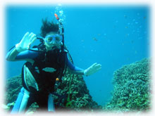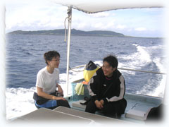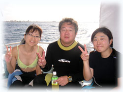 3日目最終日のエミちん。よかったねーラストで晴れて・・。そして今日は初ばななのゲストさん。まずは、ナカノさん。今まで石垣島の北部や川平は潜ったことが有るそうですが、街エリアはお初。そして、北国北海道から道産子組。カズコさんです。9月ばななに来てくれたマユちんと一緒に講習を受けてダイバーになったんだけど・・・講習での想い出がトラウマになり、それ以来潜っていなかった・・・講習後3年のブランクダイバーさんです。忘れていることや不安も大きいと思うので、今日はマンツーマンでゆっくり想い出しながらリビュー講習ファンダイブです。←カズコさんは晴れオンナだそうです。今日の1本目は、静かな大崎へ。
