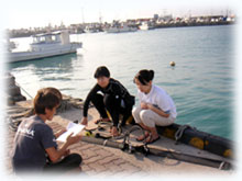 出航前に、ナビゲーションのシュミレーション。タテノさんは去年の夏にアドバンス講習は受けておられますが、「もう一度復習してみたい・・・」と言うことで、急遽、ナビゲーションコースにご参加です。二人でコンパスの使い方の練習〜。その後、大崎に向けて出港です。