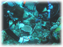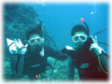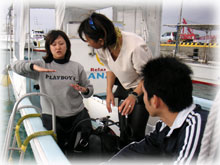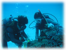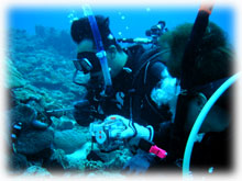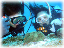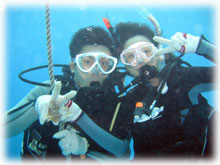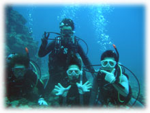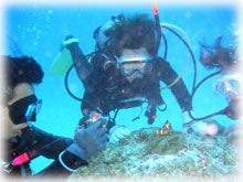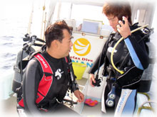 昨日とはメンバーサンが入れ替わりました。。今日は、先月28日にお越し下さった地元ダイバーのカガヤツトムさん・ユミコさんご夫妻は本日初潜り。お二人のダイバー友達がまたまた秋田からお越しになり、2夫婦揃ってのファンダイブとなりました。お友達は、ホンダヨシノブさん・リカさんご夫妻。2年前グアムで潜られてからお子さんを妊娠されたため、2年ぷりのダイビングだそうです。その2年前のグアムダイブでは、耳がぬけにくい体質のヨシノブサンはなんとまぁ潜行ロープに置き去りに・・・。今日は、サンゴ初ダイブのリカさんの緊張と、そして飛行機の気圧変化でも耳がぬけないヨシノブさんの耳が大きな不安・・・とのことですが、とにかく、久しぶりダイブを楽しんでもらいましょっ〜ぉぉぉ〜。