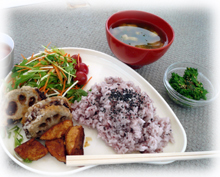 今日は、レンコンのはさみ揚げと 菜の花のおひたし、 今年とれたてのアーサ使用のアーサ汁など・・。