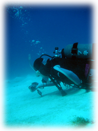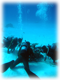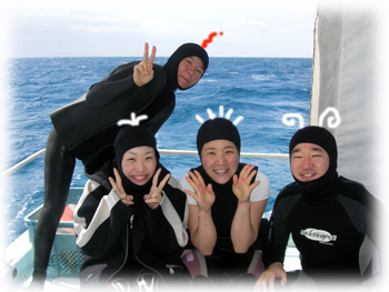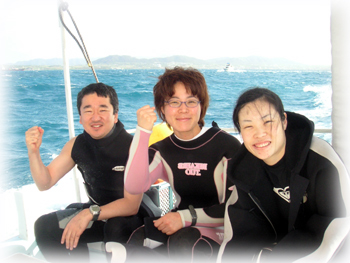 今日は昨日のメンバーサンで出港です。 両手に花・・で燃えている(笑)ハットリさん。 きのう50本を迎えたチエさん。 そしてもう島の住人になろうとしているアキコさん。 このメンバー、初対面同士なのになんだか昨日から 和気藹々で楽しそう〜。 昨日の夜から風が轟々・・・海は時化気味です。 今日は竹富の南へ行きました。 太陽の下、エメラルドの海がまぶすい・・ 。